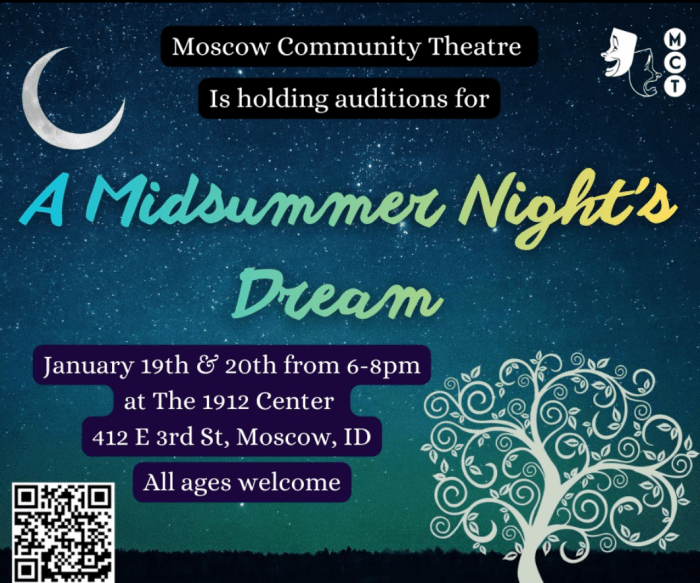 January 31, 2019 by MoscowCommunityTheatre Auditions for A Midsummer Night’s Dream Moscow Community Theatre would like to thank our Sponsors! Share this: Share on X (Opens in new window) X Share on Facebook (Opens in new window) Facebook Like Loading... Related